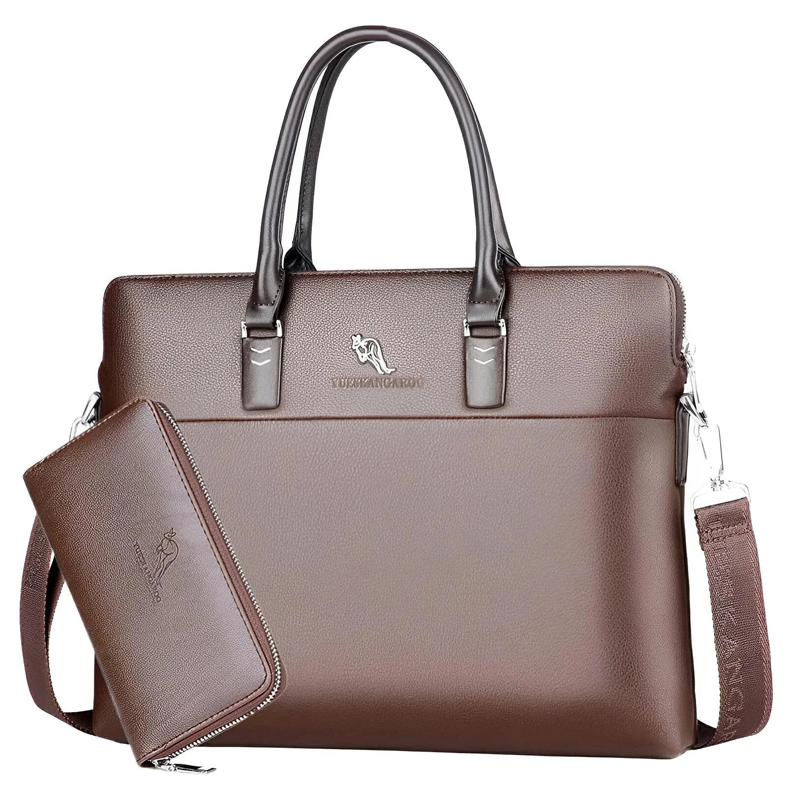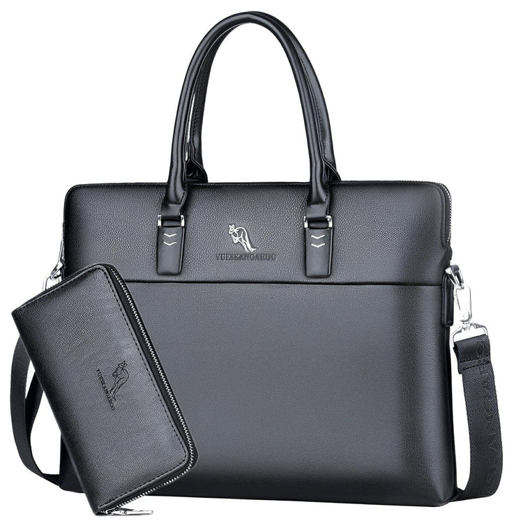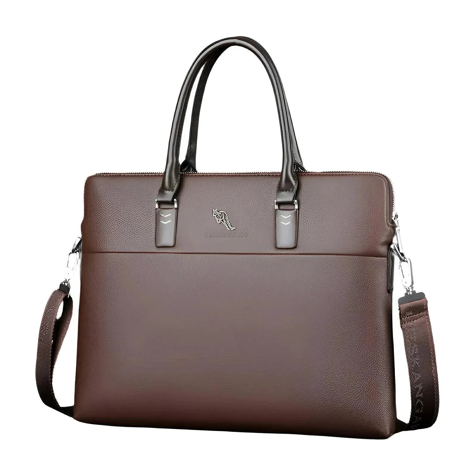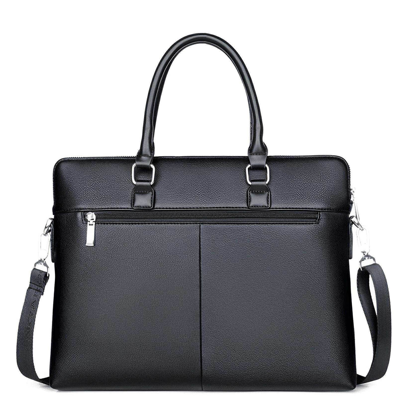 This sleek laptop bag features a polished faux leather exterior with a subtle textured finish. The bag is designed with dual sturdy handles for easy carrying, and includes an adjustable shoulder strap for versatility. The minimalist aesthetic is enhanced by the embossed surface, making it suitable for both professional and casual settings.