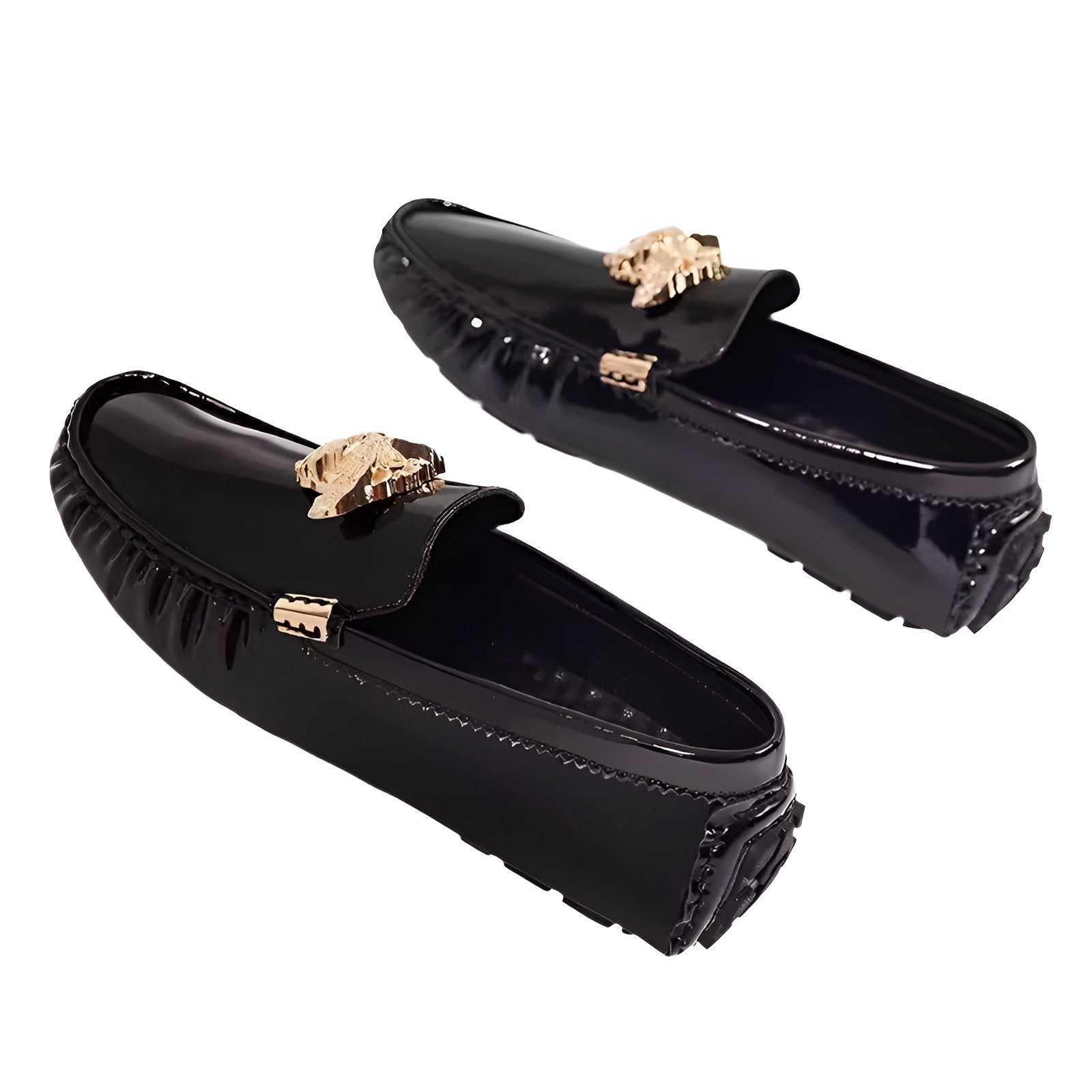 This striking pair of loafers feature a smooth leather exterior, exuding a luxurious aesthetic. The slip-on design is complemented by an embellished gold-tone appliqué, adding a touch of opulence. The shoes are crafted with a low profile heel for comfort, making them perfect for both formal and fashion-forward settings. Take center stage.