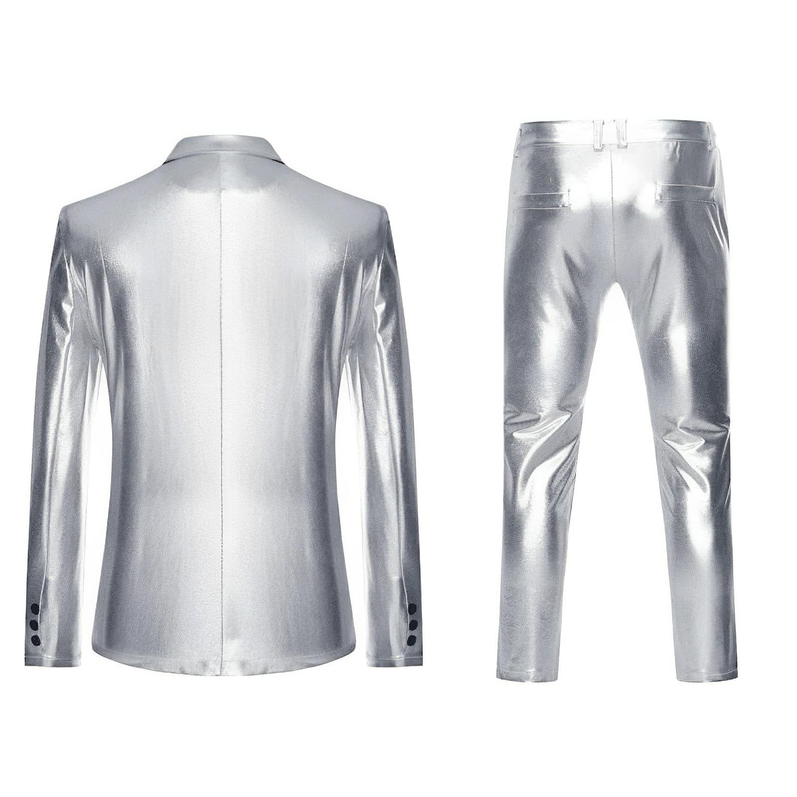 This striking faux leather suit features luxurious craftsmanship and a reflective metallic exterior, exuding a contemporary and stylish appeal. The fitted design includes sleek lapels and two front pockets with flaps, complementing the overall tailored look. This versatile piece is perfect for both casual and semi-formal occasions, offering a bold twist to traditional suiting. Command attention.