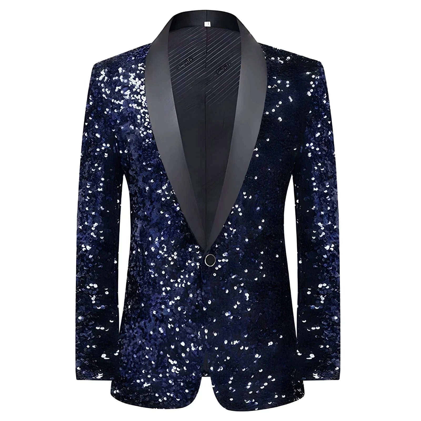 This elegant blazer features a rich fabric adorned with brilliant sequin crystals, creating a striking visual contrast. The blazer has a tailored fit, with a satin lapel that complements its luxurious detailing. Ideal for formal or fashion-forward events, this statement piece combines traditional tailoring with bold, opulent flair. Own the moment.