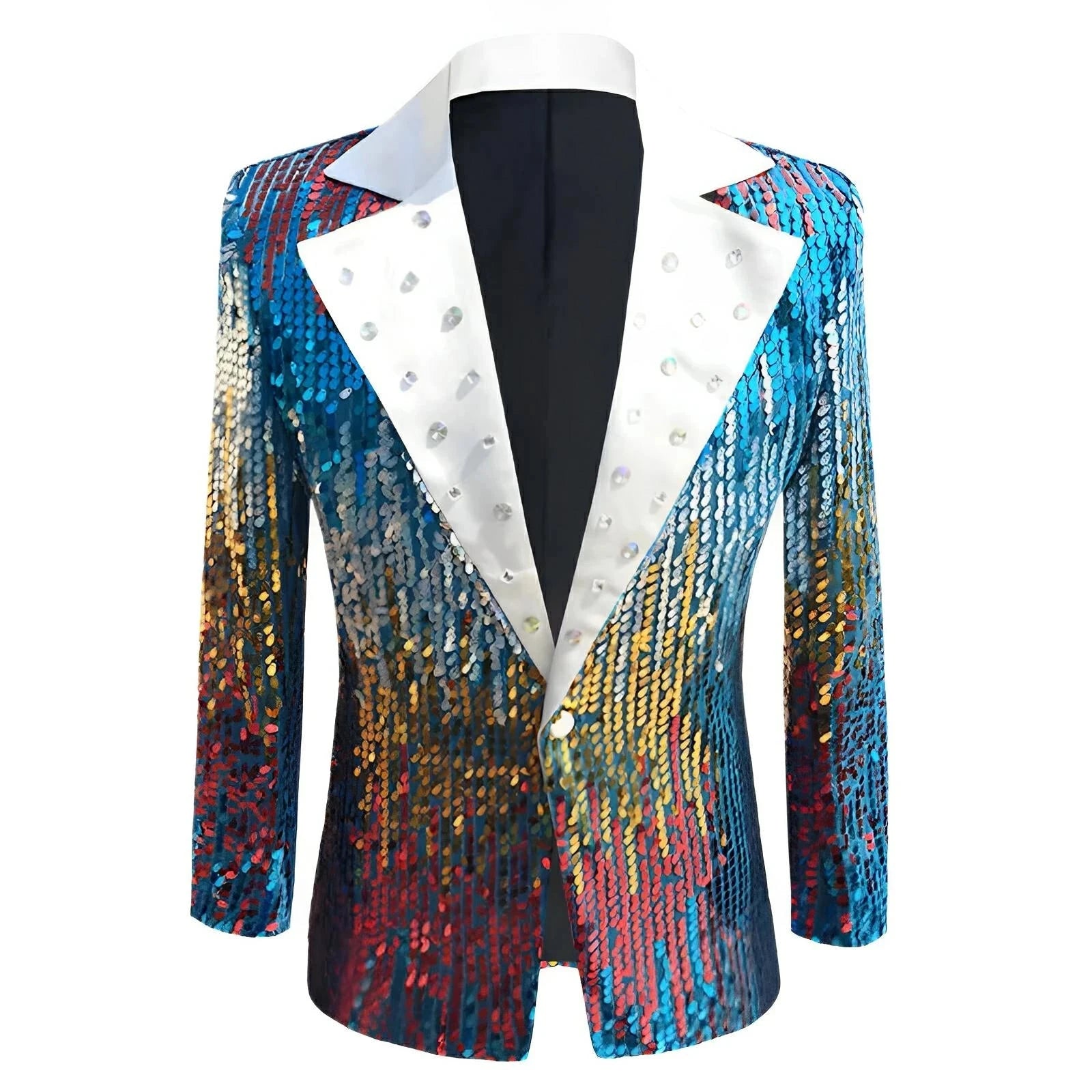 This striking jacket features a rich fabric adorned with brilliant sequin crystals, creating a stunning visual contrast. The blazer has a tailored fit, with a white lapel that complements its luxurious detailing. Ideal for formal or fashion-forward events, this statement piece combines traditional tailoring with bold, artistic flair. Take center stage.