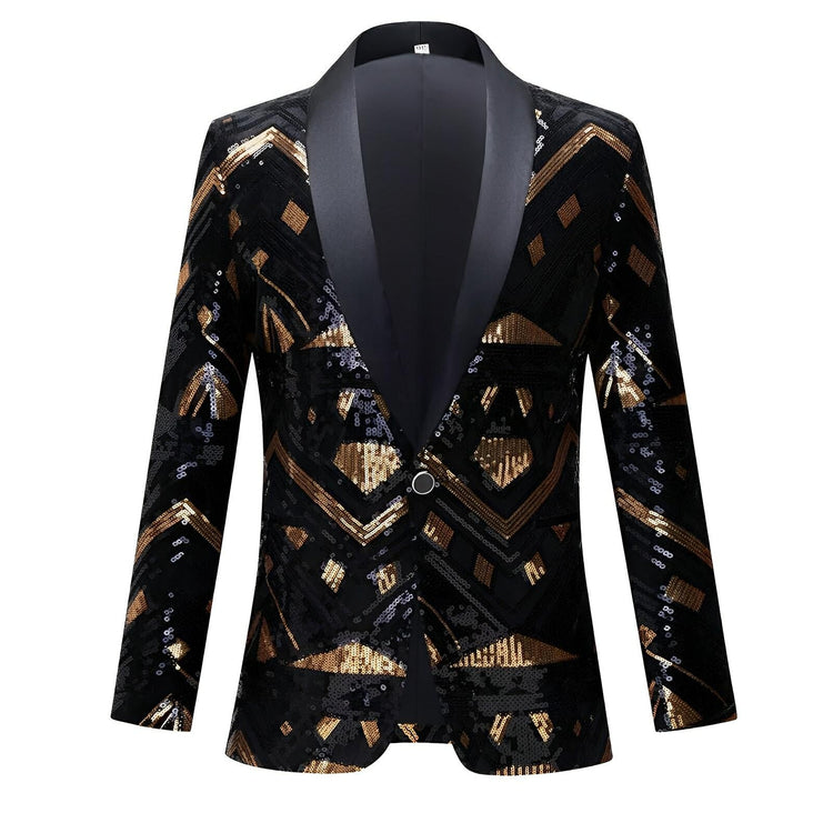 This elegant men's blazer features a rich fabric adorned with brilliant sequin crystals, creating a striking visual contrast. The blazer has a tailored fit, with a satin lapel that complements its luxurious detailing. Ideal for formal or fashion-forward events, this statement piece combines traditional tailoring with bold, artistic flair. Own the moment.