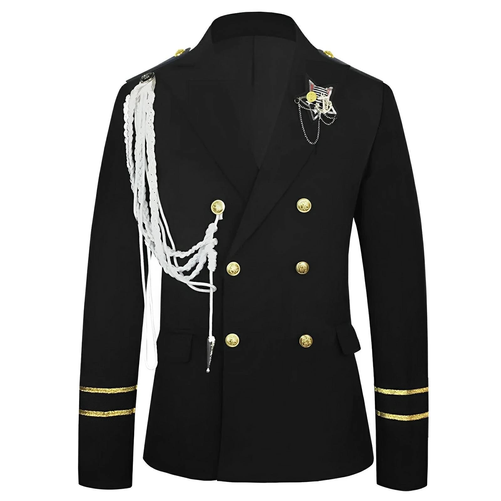 This striking blazer features stylish embroidered appliqués that run luxuriously along the front, creating a dynamic visual effect. It has a sleek lapel, and polished gold buttons that enhance its captivating appearance. The tailored fit, and opulent design make this jacket suitable for both formal and festive occasions. Command attention.
