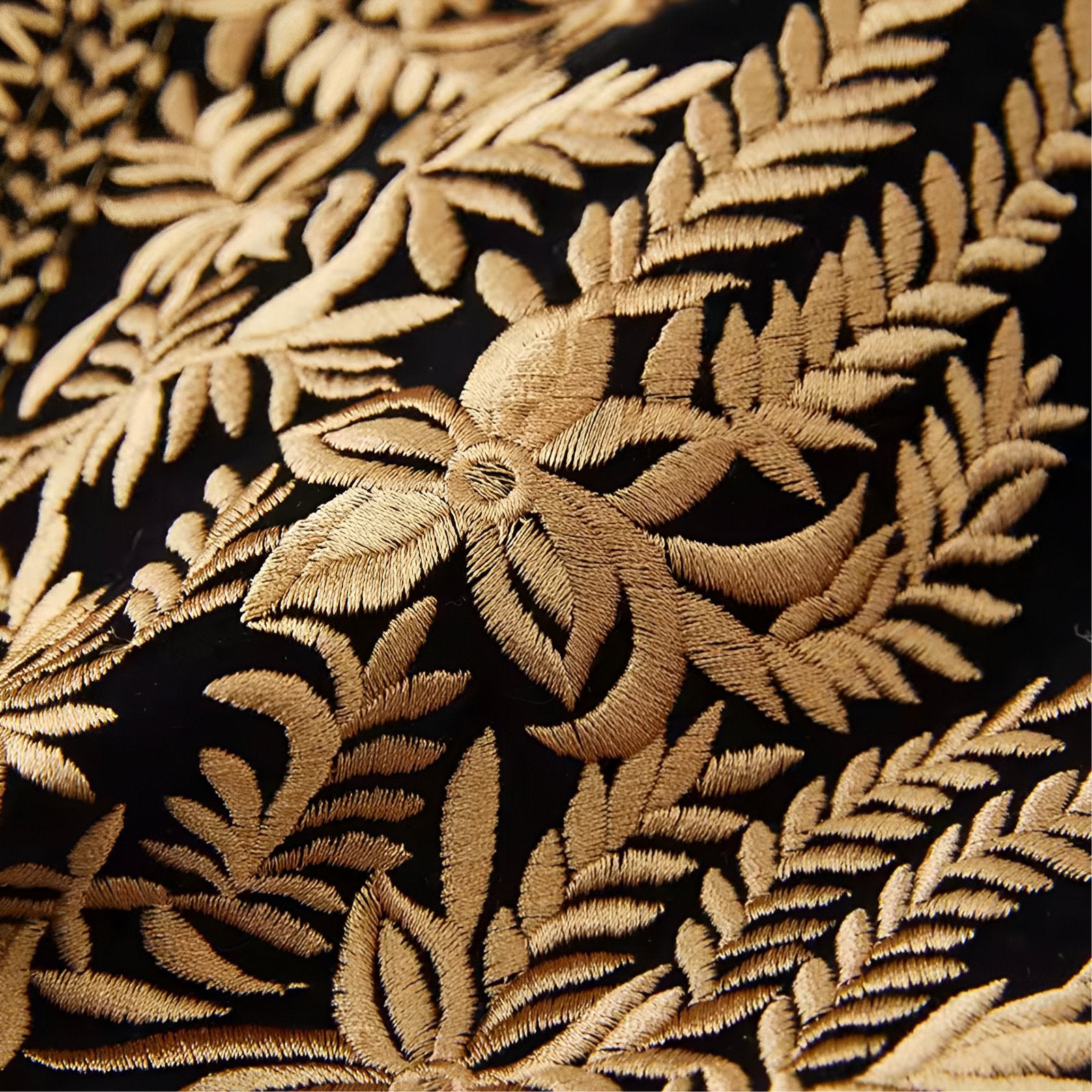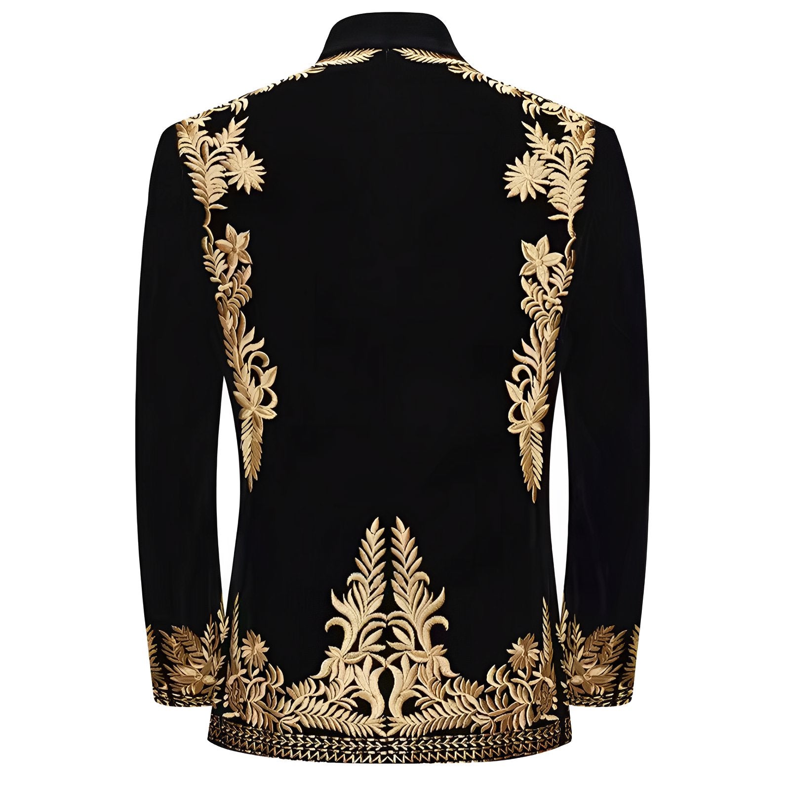 This exquisite blazer features a rich velvet fabric adorned with intricate floral embroidery, creating a striking visual contrast. The blazer has a tailored fit, with a sharp lapel that complements its luxurious detailing. Ideal for formal or fashion-forward events, this statement piece combines traditional tailoring with bold, opulent flair. Be unforgettable.