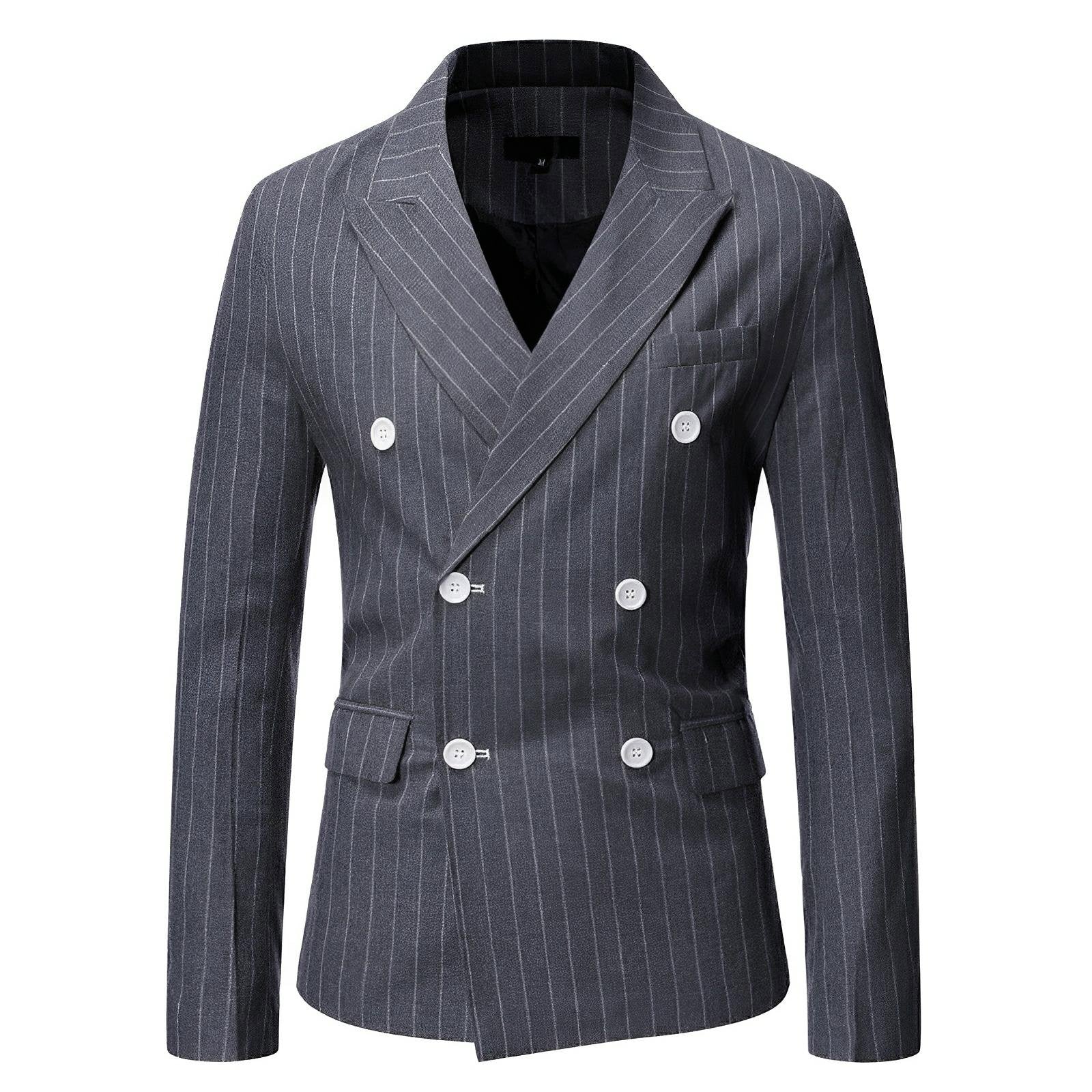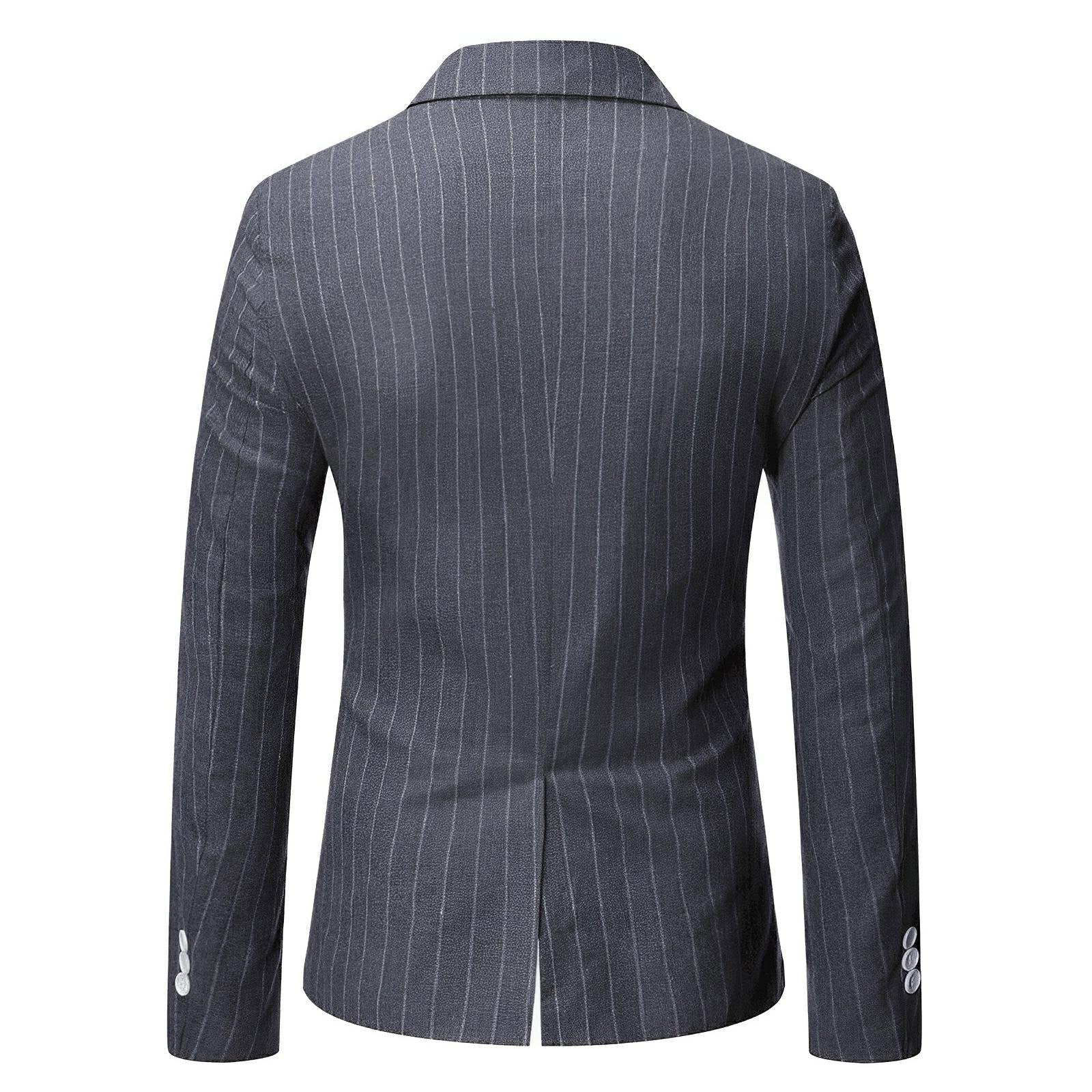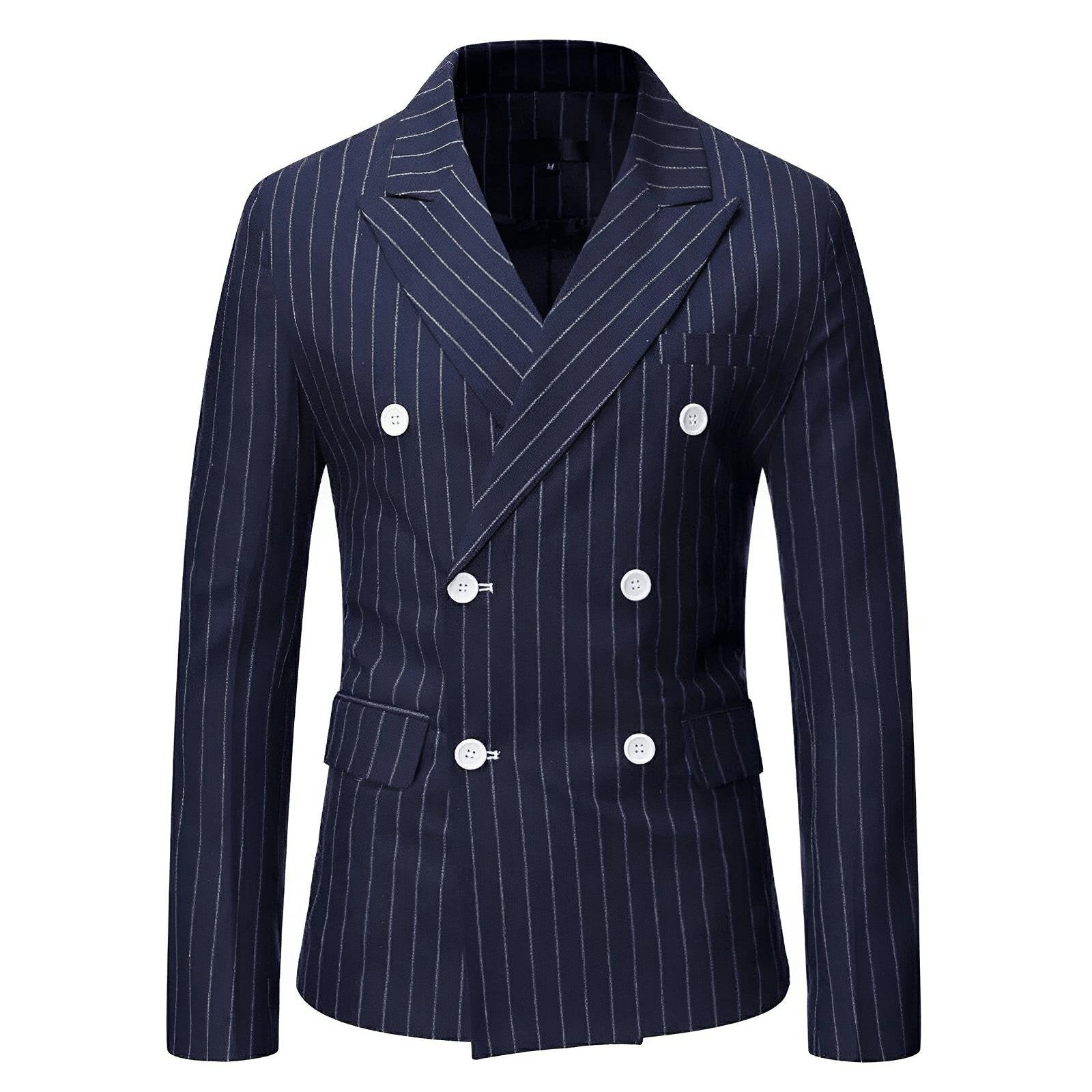 This sharp blazer features luxurious craftsmanship and sophisticated pinstripe detailing, exuding a contemporary and stylish appeal. The fitted design includes sleek lapels and two front pockets with flaps, complementing the overall tailored look. This versatile piece is perfect for both formal and semi-formal occasions, offering a modern take on traditional suiting. Command attention.