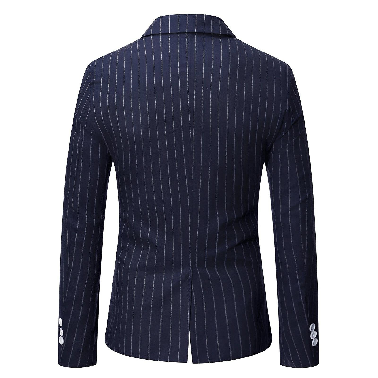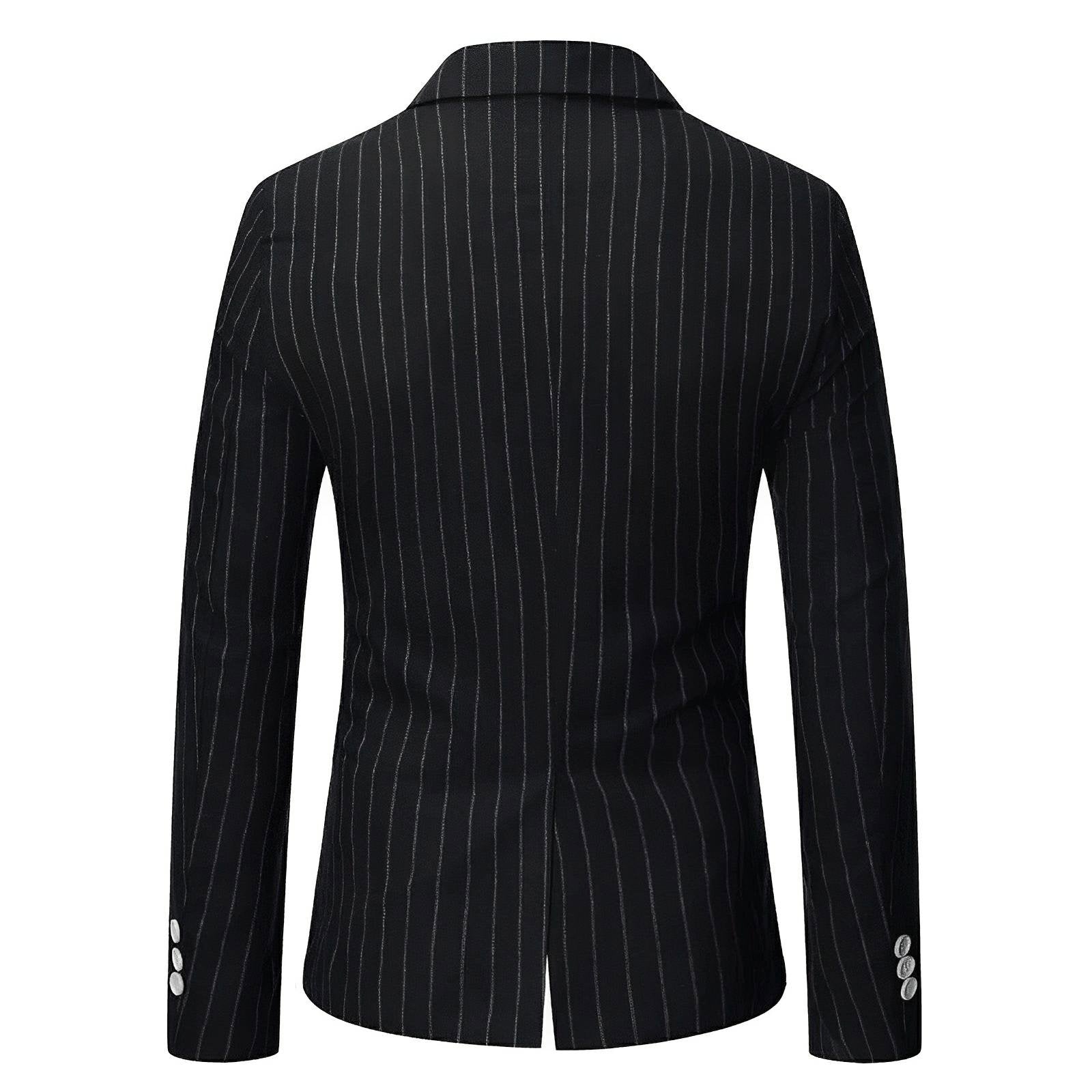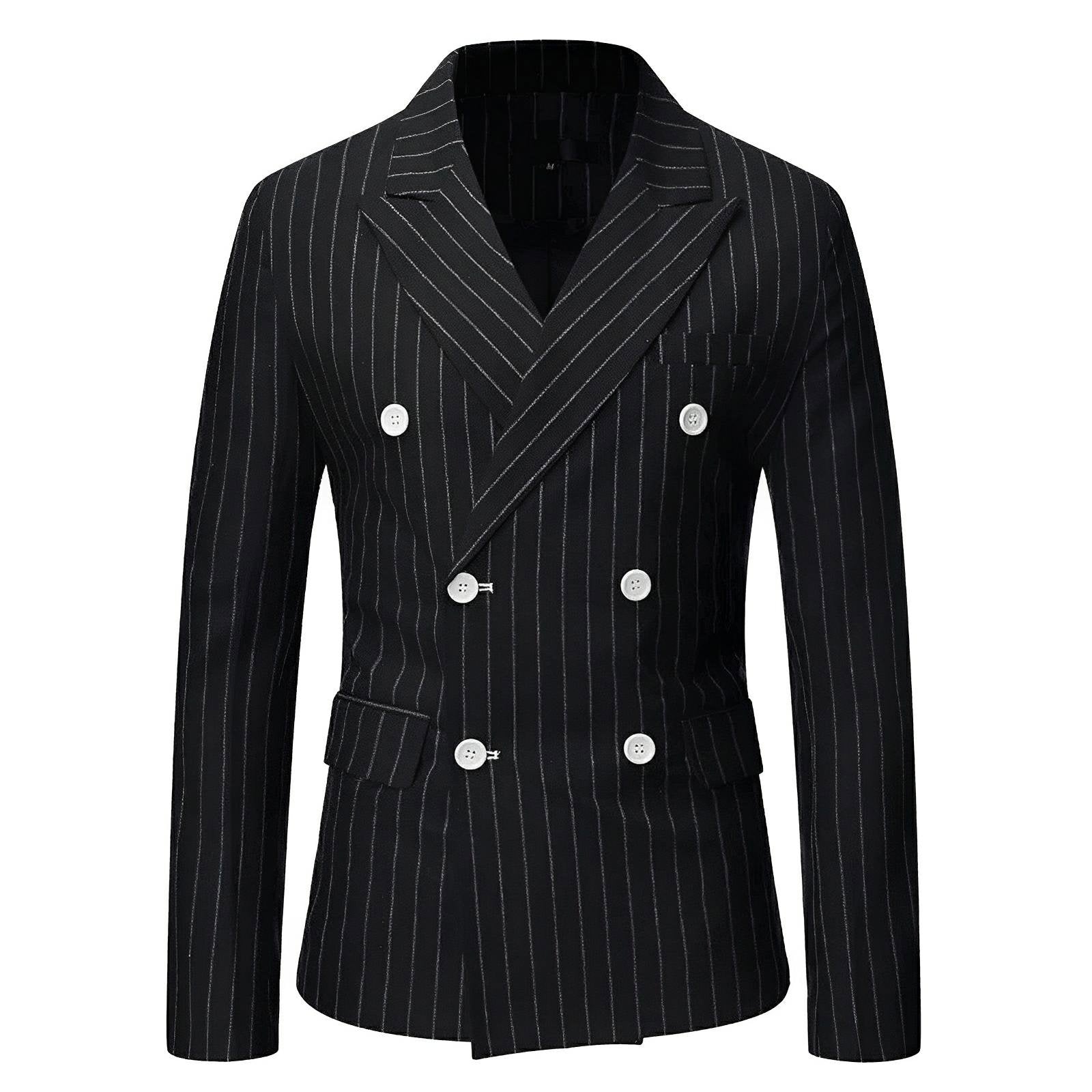 This sharp blazer features luxurious craftsmanship and sophisticated pinstripe detailing, exuding a contemporary and stylish appeal. The fitted design includes sleek lapels and two front pockets with flaps, complementing the overall tailored look. This versatile piece is perfect for both formal and semi-formal occasions, offering a modern take on traditional suiting. Command attention.