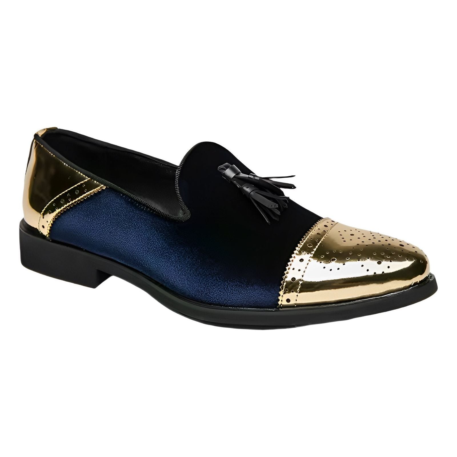 These stunning loafers feature a smooth, suede exterior, exuding a luxurious aesthetic. The slip-on design is complemented by a polished gold toe, adding a touch of opulence. The loafers are crafted with a low block heel for comfort, making them perfect for both formal and semi-formal occasions. Steal the show.